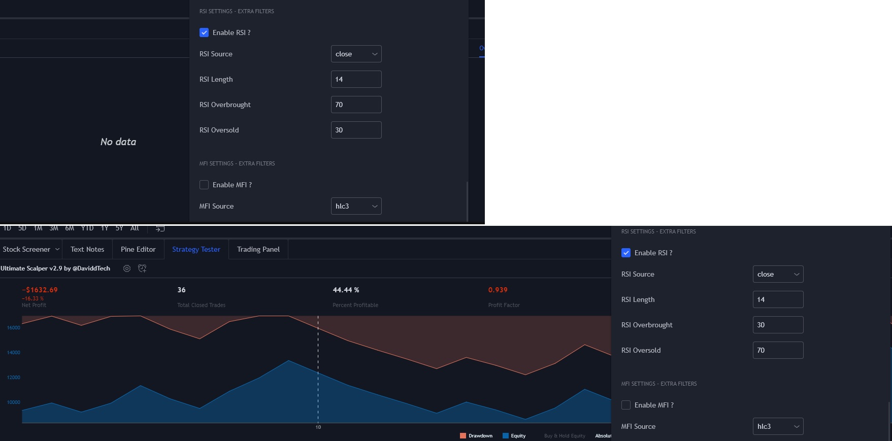 The strategy gives better results when you invert the values of overbought and oversold.